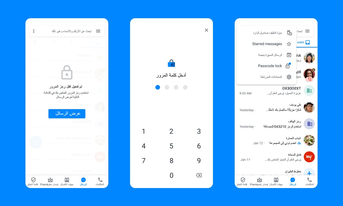 يحافظ رمز المرور المخصص لرسائل Truecaller على خصوصيتك من خلال إضافة مستوى من السلامة والأمان إلى صندوق الوارد إليك حتى لا تتمكن عيون الأشخاص المتطفلة من قراءة الرسائل المرسلة إليك.وعند إعداده، يطلب توفير رمز مرور كلما حاولت أنت أو أي شخص آخر فتح صندوق الرسائل الواردة على الهاتف.