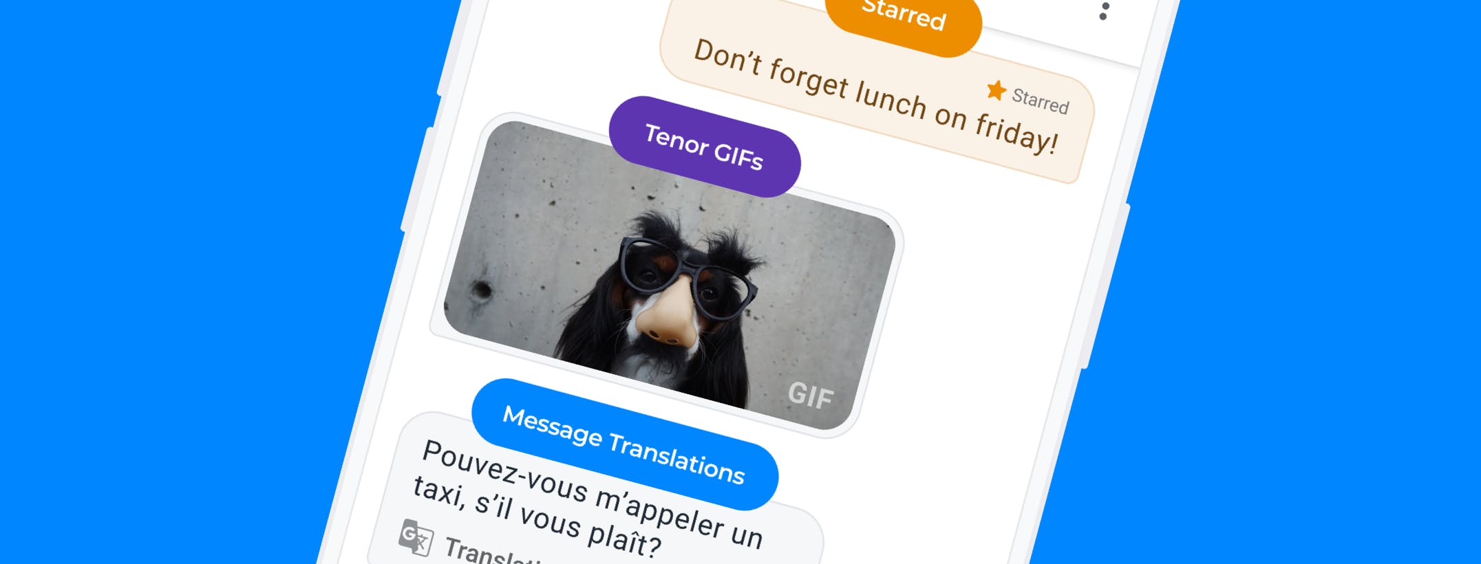 Sometimes an emoji doesn’t quite cut it. Choose from 1000s of GIFs to send instead. Use the Tenor-powered search bar to find the exact GIF you’re looking for, eg. ‘dog with disguise’.