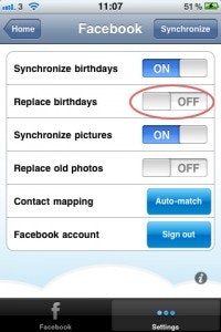 Apparently there has been some bugs regarding the birthday synchronization on iPhone when updating to the new iOS5. We have released an update to fix this issue. If you have encountered this problem please follow these steps to fix the problem: