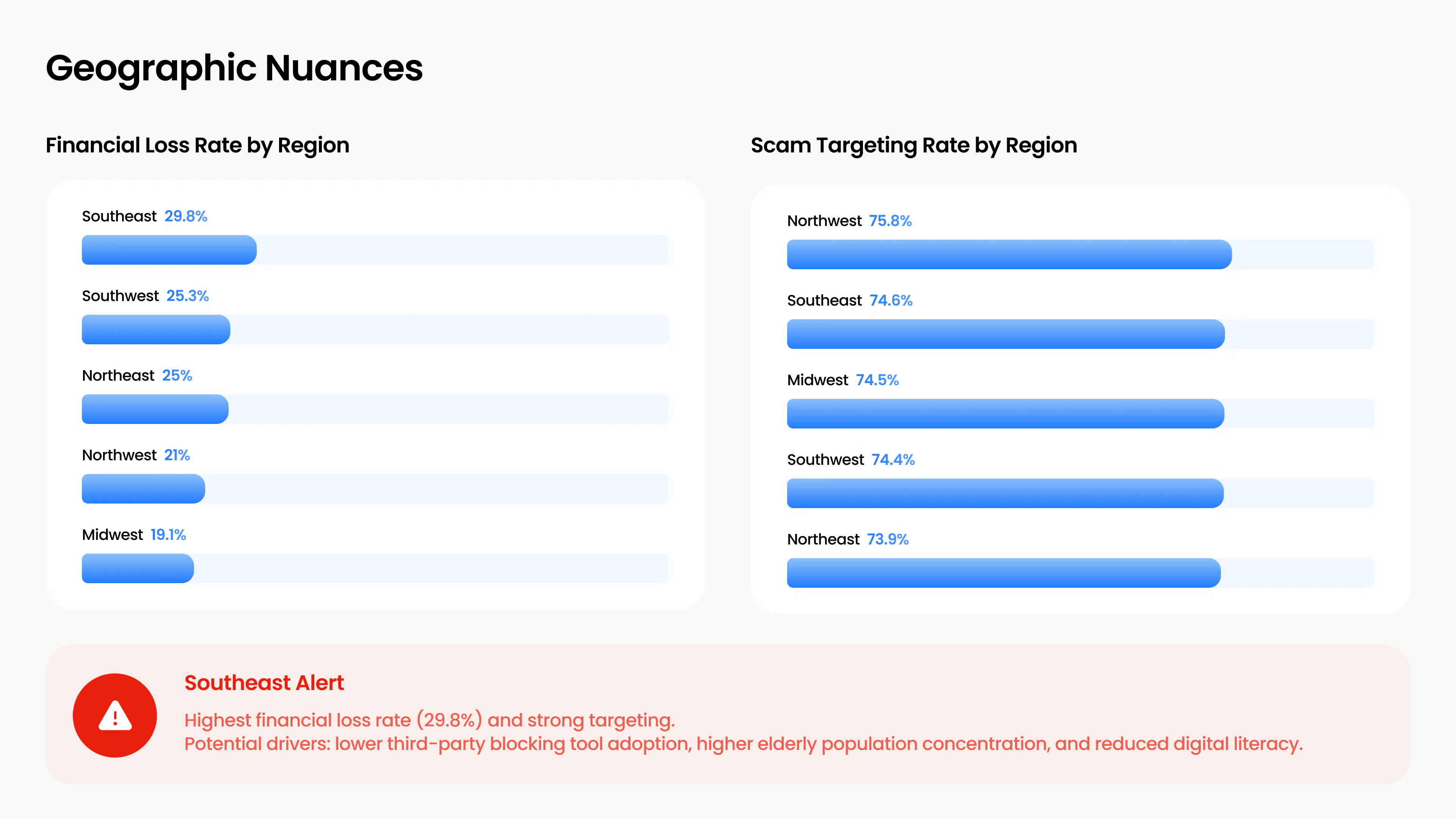 Targeting rates are remarkably flat across regions - 73.9% to 75.8%. Losses are not. The Southeast posts the highest loss rate at 29.8%, followed by the Southwest (25.3%) and Northeast (25%); the Midwest sits lowest at 19.1%. Lower adoption of third-party blocking tools, more older adults and digital-literacy gaps likely explain the Southeast gap.