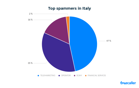Telemarketingcalls from energy and television providers (47%) continues to be the biggestspammers in Italy. The operators also account for a big portion of thespammers.