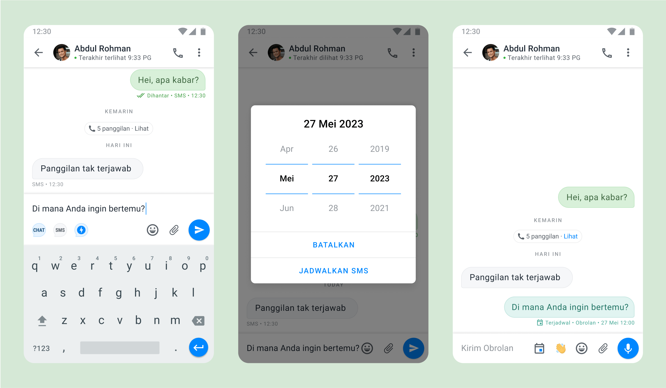 Pilih saja ikon ini saat mengirim pesan, lalu pilih tanggal dan waktu. Pesan Anda akan dikirimkan pada waktu yang dipilih, dan Anda selalu bisa melihatnya terjadwal di chat Anda!